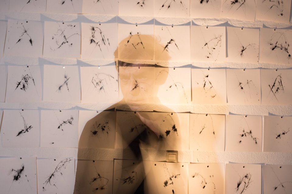 Simon Berz (*1967) schlägt mit elektrifizierten Schlagzeugstöcken Bilder auf Papier – während er spielt, entsteht die Notation. Der Klang der Geste wird hörbar, die Bewegung sichtbar. Jede Linie ist zugleich Musik und Partitur, jeder Schlag zugleich Improvisation und Komposition. Die entstehende Notation wird von Künstler:innen wie Gabriel Obergfell, Timo Ullmann, Aki Maeda, sowie dem Filmemacher Andi Hofmann und der SRF-Korrespondentin Judith Huber neu interpretiert.